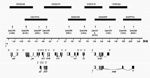 STS Dm0073 identified six P1 clones. The scale bar is in kbp. The drawings at the bottom of the figure